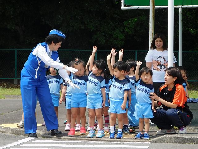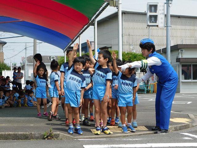 5月31日(火)磐田市交通安全センターを利用し磐田警察署婦人交通指導員の方々により、交通事故にあわないように信号の見方・道路の歩き方などをお話ししていただいた後、実際にセンターの信号器を点灯させていただき歩く練習をしました。